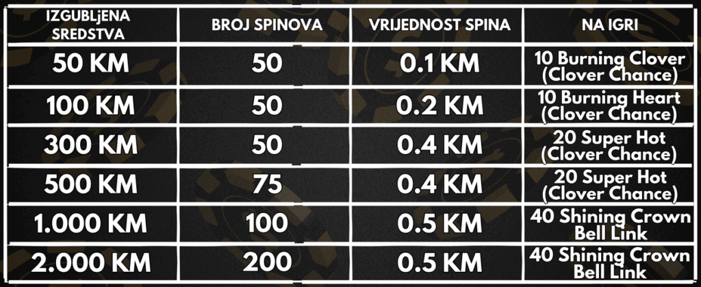 To nije sve, ukoliko niste imali sreće, spinove možete dobiti i na osnovu izgubljenih sredstava (casino bet-casino win) i to po sledećoj tabeli: