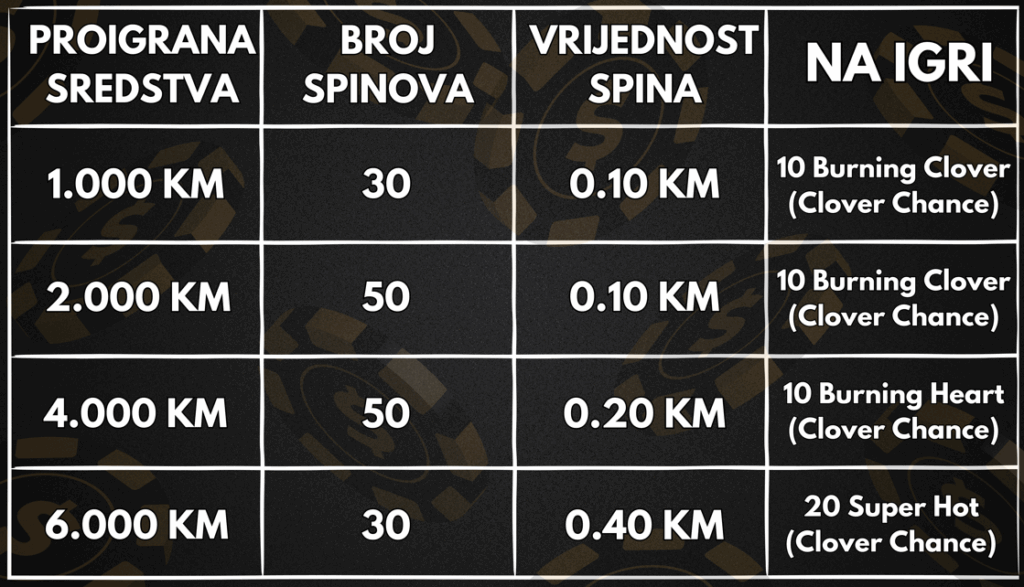 * Poklon spinove možeš osvojiti dva puta sedmično, utorkom i petkom, ukoliko ispuniš uslov iz gore navedene tabele.