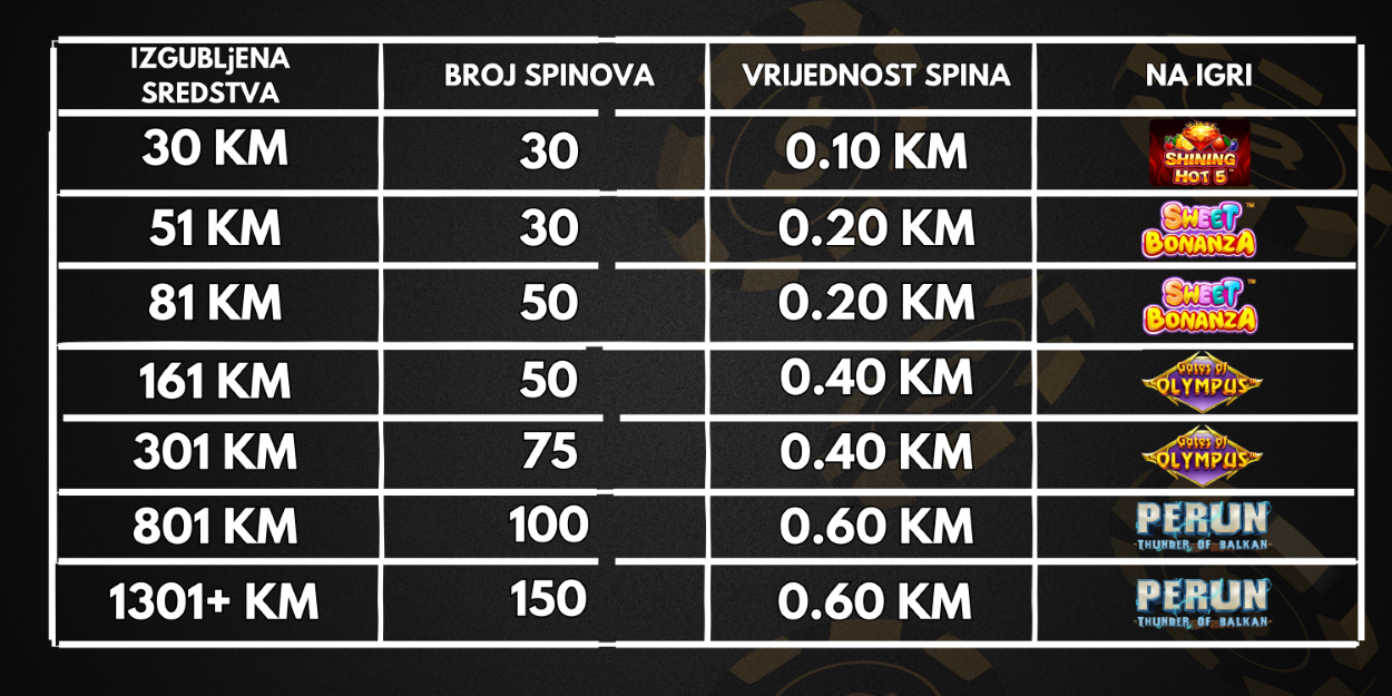 To nije sve, ukoliko niste imali sreće, spinove možete dobiti i na osnovu izgubljenih sredstava (casino bet-casino win) i to po sledećoj tabeli: