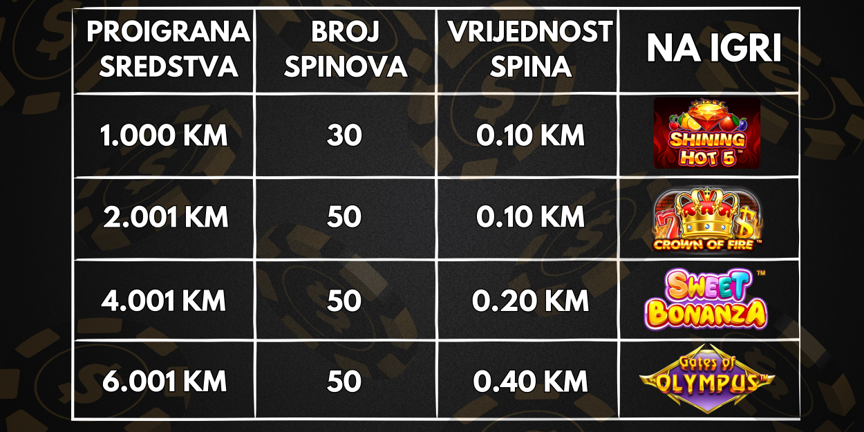 * Poklon spinove možeš osvojiti dva puta sedmično, utorkom i petkom, ukoliko ispuniš uslov iz gore navedene tabele.